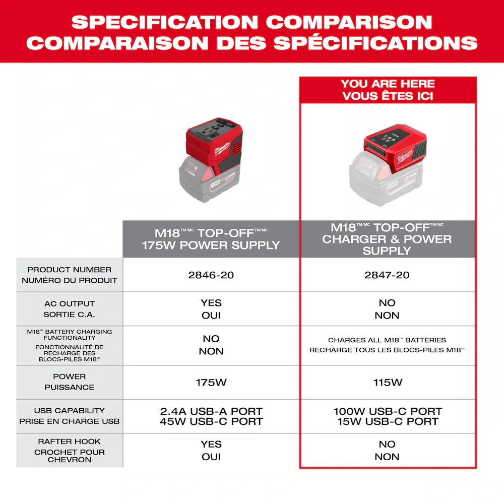 The Milwaukee M18 TOP OFF Charger and Power Supply is a compact, high-performance charging solution designed for professionals who need portable power on the go. Up to 65% smaller than traditional M18 chargers, it offers a lightweight and space-saving design without compromising on performance.