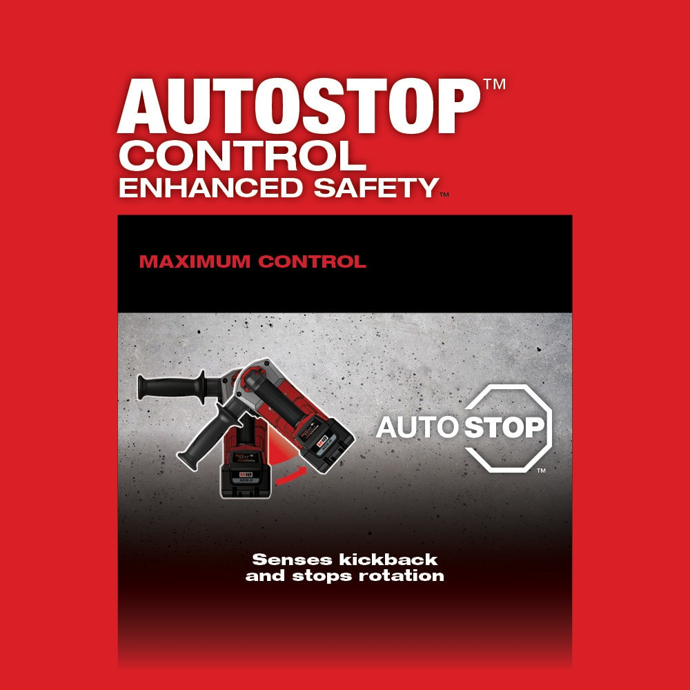 This rotary hammer is designed for superior control and safety with its AUTOSTOP Kickback Control feature, which prevents over-rotation when the tool becomes bound up while drilling through rebar or tough aggregate materials. This feature enhances user safety by stopping the tool's rotation in case of a bind-up situation.