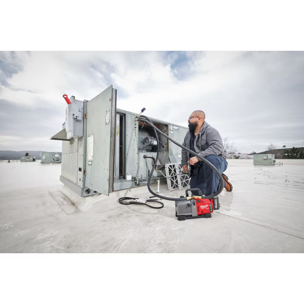 The Milwaukee M18 FUEL 5 CFM Vacuum Pump delivers cordless convenience and instant power, making fast evacuations easier than ever. Powered by M18 REDLITHIUM batteries, it provides enough runtime to handle multiple jobs on a single charge. The innovative manifold mode maximizes efficiency in manifold setups, offering up to 90 minutes of continuous operation per charge.
