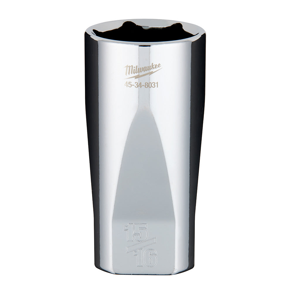 The Milwaukee 3/8-Inch Drive 15/16-Inch SAE 6-Point Deep Socket is engineered for precise and reliable fastening. Its FOUR FLAT™ design prevents rolling and ensures easy compatibility with wrenches. Constructed from high-strength chrome vanadium steel with a polished chrome finish, the socket features optimized geometry to reduce fastener rounding and stripping. Size markings are clearly stamped on the flat surfaces for quick identification, making this socket both efficient and convenient on the jobsite.