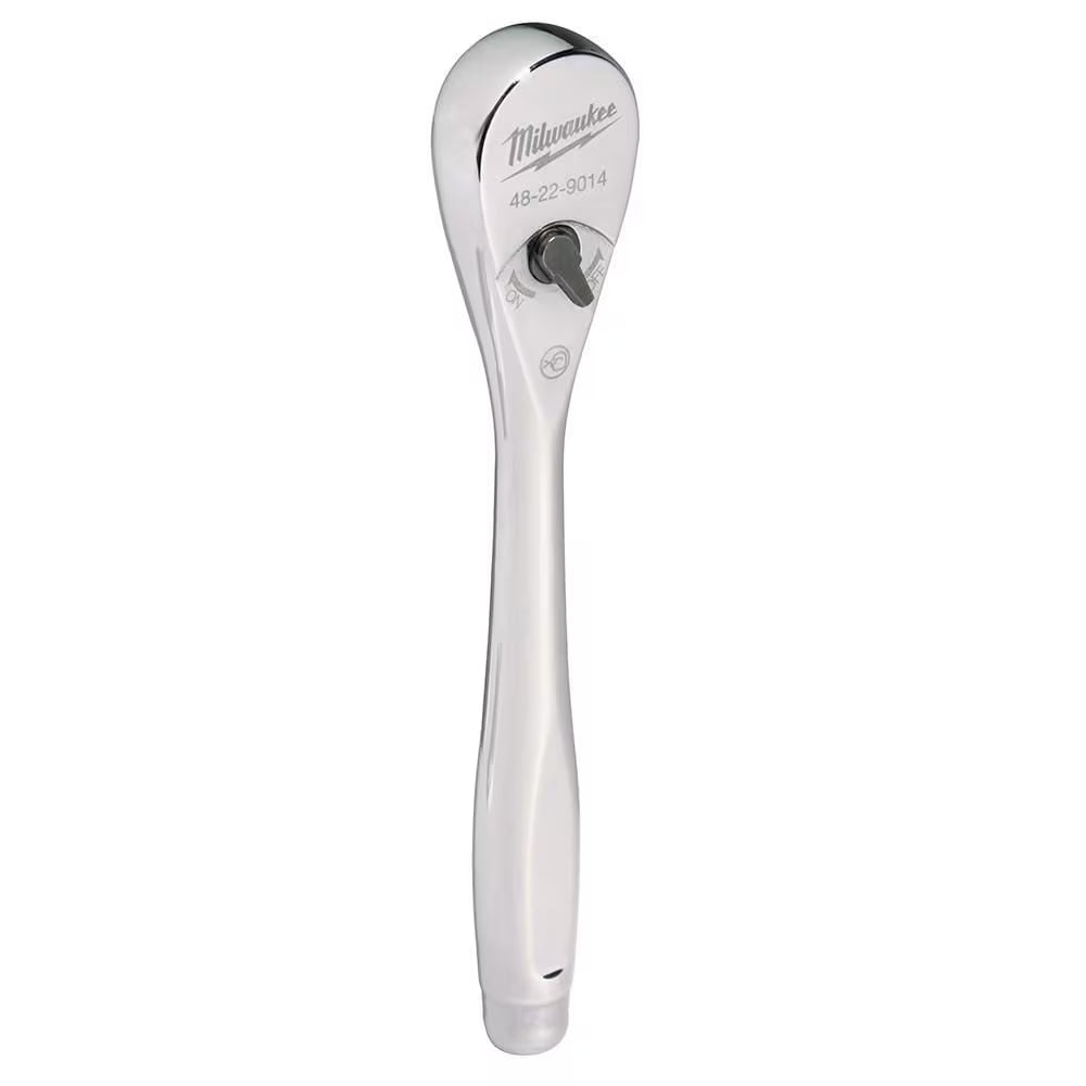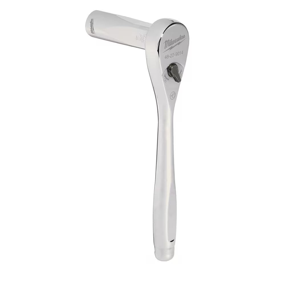 The MILWAUKEE 50-Piece 1/4-inch Drive Ratchet & Socket Set is designed for professionals who require precision and durability in tight spaces. The 90-tooth ratchet offers a 4-degree arc swing and a slim profile, enabling work in confined areas. Each socket features four parallel flats to prevent rolling and ensure wrench compatibility, while optimized geometry reduces bolt rounding and stripping. Stamped size markings on the flats provide easy identification for quick selection.