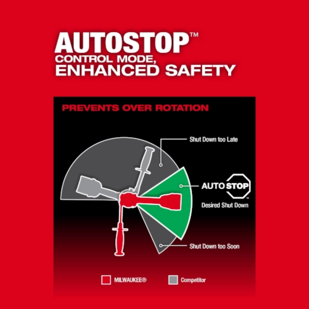 Equipped with AutoStop™ Control Mode, the tool offers enhanced operator safety by preventing dangerous over-rotation in the event of a bind-up. The dedicated AutoStop™ indicator light alerts users instantly during a protection event.