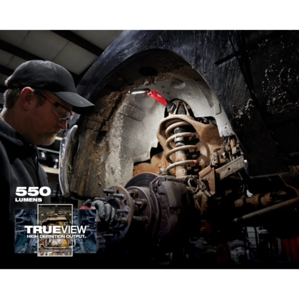 This rechargeable LED work light delivers up to 550 lumens of TRUEVIEW high-definition brightness with four versatile modes: front, back, dual, and inspection. Enjoy 2 hours of run-time on high, adjustable brightness settings, and convenient charging via the USB-C port or the included magnetic charging dock with an extra battery slot for uninterrupted all-day performance.